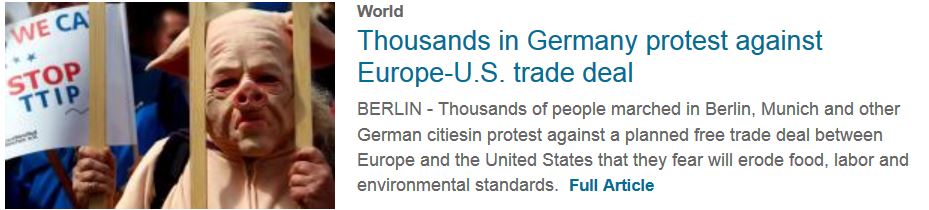 Heute gab es weltweite Proteste gegen das geplante Freihandelsabkommen TTIP. Angela Merkel befand sich heute ausgerechnet auf einer Wahlkampfveranstaltung und sah sich genötigt mal wieder zu beschwichtigen: