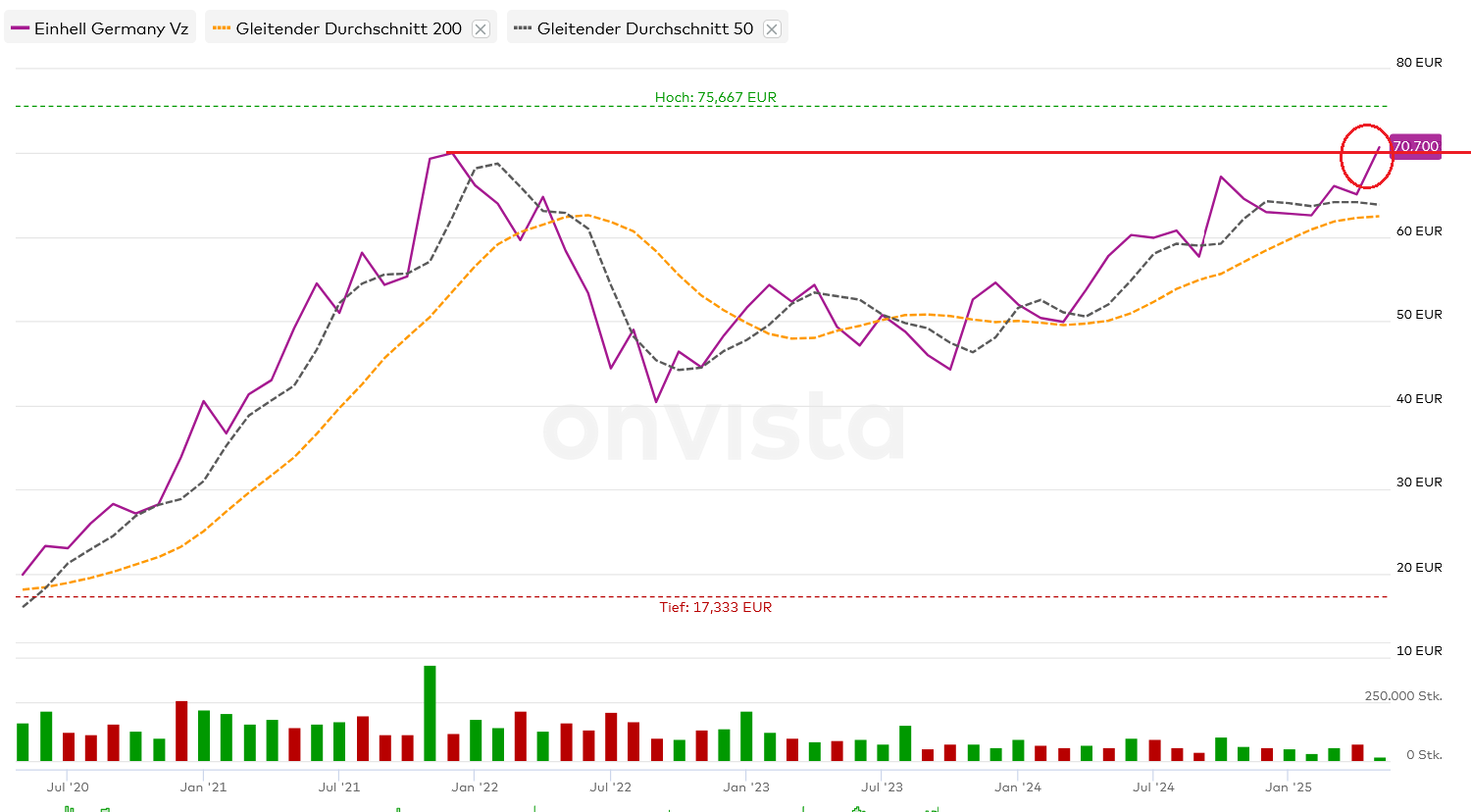 Das Allzeithoch (splitbereinigt) aus Anfang 2022 (knapp 75 Euro) ist auch nicht mehr in weiter Entfernung