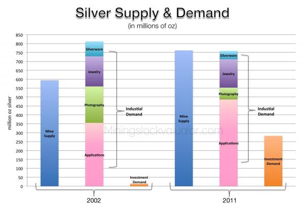 Die industrielle Nachfrage nach Silber und sogar für Schmuck ist seit 2002 anders als bei vielen anderen Rohstoffen rückläufig. Lediglich das Volumen der Investorengelder ist in die Höhe geschossen. Die Preisentwicklung konnte durch die Ausweitung des Angebotes nicht gestoppt werden - möglicherweise werden die Preise durch die Terminmärkte noch weiter getrieben.