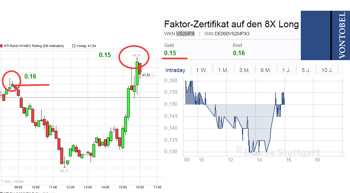 Eigentlich bescheißen sie alle beim Öl Preis. Faktor 8 Vontobel Bank 0,34 Euro vor zwei drei Wochen beim WTI Kurs 47,60 jetzt 0,15 € alles nur noch Verbrecher.