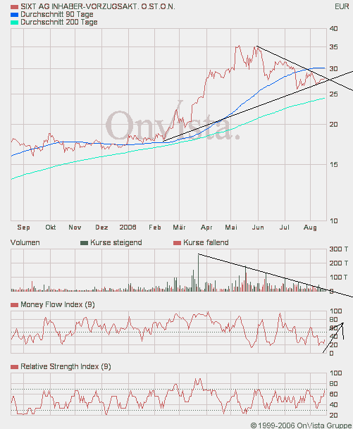 Rückblick: Die SIXT Aktie startete im Mai 2003 eine Aufwärtsbewegung innerhalb eines Trendkanals. Innerhalb dieses Kanals brach die Aktie im Januar 2006 über den primären Abwärtstrend aus. In der letzten Märzwoche durchbrach die Aktie die obere Begrenzung dieses Kanals und stieg in einer schnellen Rallye auf 48,41 Euro an. Seit diesem Hoch von Anfang Mai befindet sich die Aktie in einer Seitwärtsbewegung zwischen diesem Hoch und 26,80 Euro. Zusätzlich unterstützt wird die Aktie durch die obere Begrenzung des Aufwärtstrendkanals. Diese liegt in der laufenden Woche bei 38,04 Euro