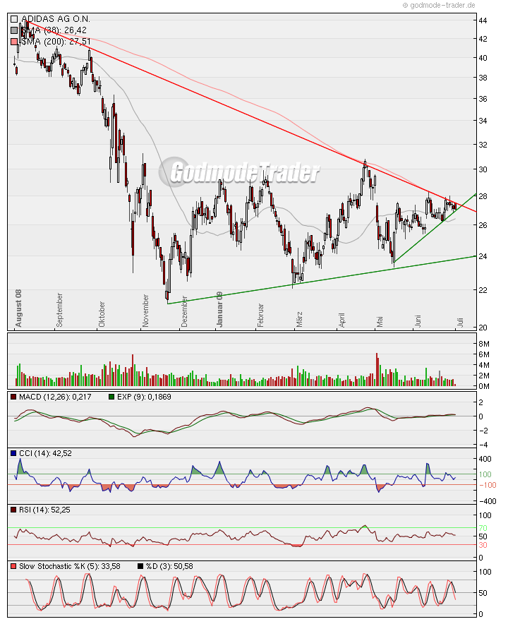 Hier scheint es ziemlich spannend zu werden in den nächsten Tagen. Zur Erklärung: Seit August 2008 hat sich der eingezeichnete Abwärtstrend ausgebildet. Nachdem Ende April ein Versuch, aus diesem Trend auszubrechen, gescheitert ist, steuern wir jetzt auf einen weiteren Anlauf zu. Wie man sieht, bildet sich ein Dreieck aus. Der Ausbruch daraus dürfte maßgeblich für den, zumindest kurz- bis mittelfristigen, Kursverlauf sein. Während der letzte Ausbruchversuch gescheitert ist, sehe ich für diesen größere Chancen. Zum einen steht ein Schnitt der 38/200 Tage Durchschnitte bevor, was beim letzten Versuch nicht der Fall war. Des weiteren weisen auch die Indikatoren eine wesentlich bessere Situation als beim letzten Mal aus. MACD, RSI und Slow Stochastic befinden sich auf einem niedrigerem Level. Sollte dieser Versuch jedoch abermals scheitern, dürfte der Kurs spätestens bei der unteren, grün eingezeichneten, Trendlinie unterstütz sein. Insgesamt würde sich der Chart dann immer weiter im eingezeichneten Dreieck zuspitzen und irgendwann ausbrechen. Sollte dieser Ausbruch nachhaltig sein, dürfte dies ein Indiez für den weiteren Kursverlauf sein. Hier bieten sich dann günstige Einstiegsmöglichkeiten. Es bleibt also abzuwarten, wann der Ausbruch vonstatten geht.