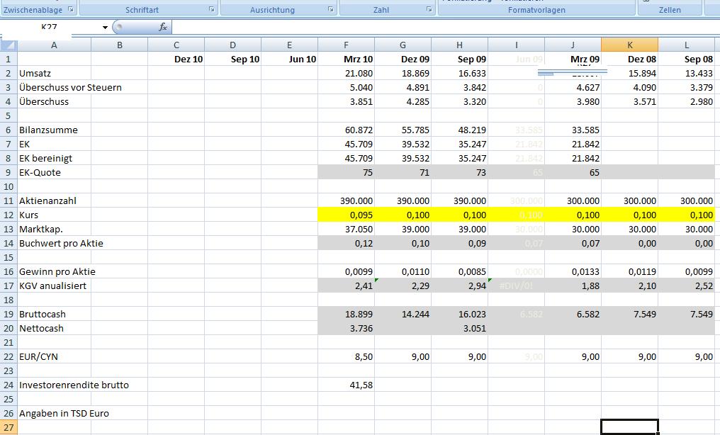 Bezogen auf den 30.6.2010 entspricht das EPS von 33,46 Renmimbi 4,0 Euro-Cent.