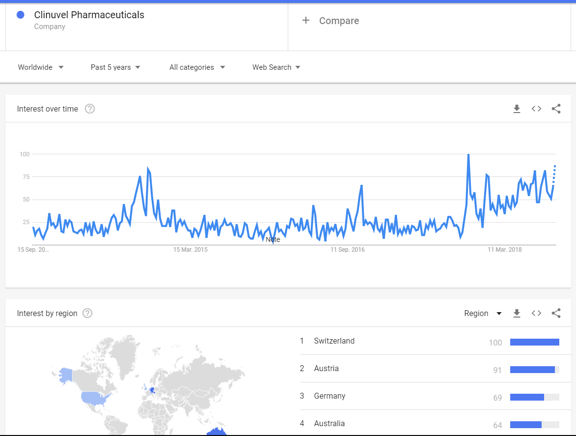 das interesse (google suche nach clinuvel) steigt allgemein, aber es ist vor allem in deutschland gerade auf einem höchststand was als grund für den gestiegenen chart genannt werden kann https://trends.google.com/trends/...y&geo=DE&q=%2Fm%2F0cqdxgb