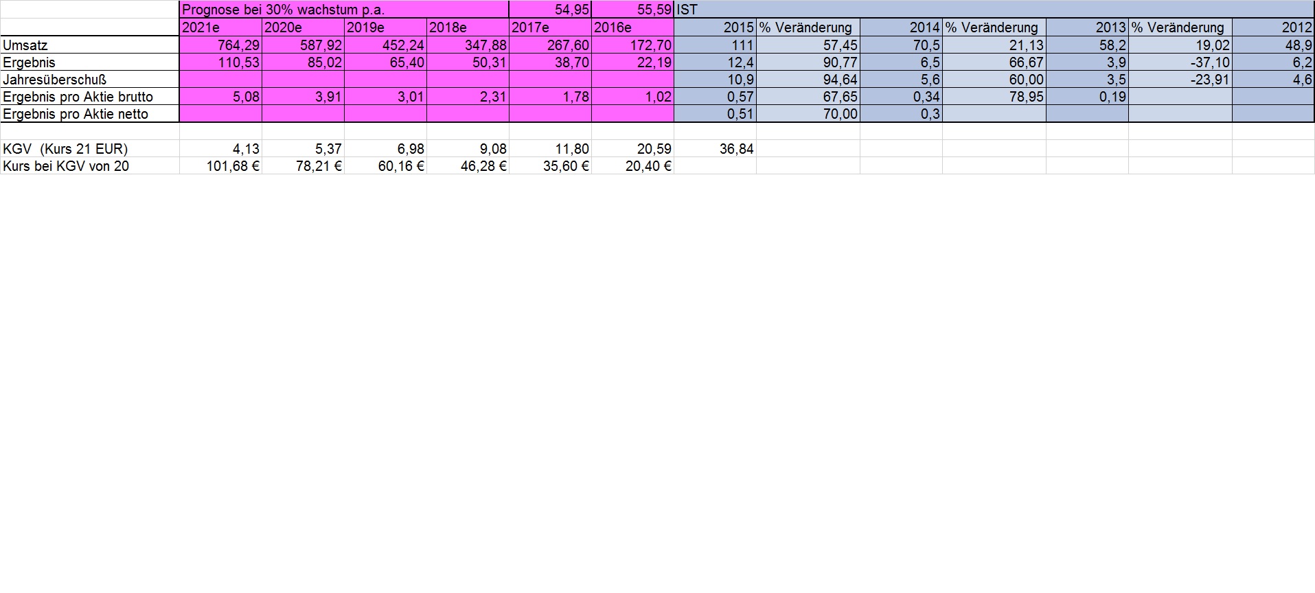 In meiner Prognose für 2016 und 2017 habe ich auch ein Umsatzwachstum von ca. 55% unterstellt. Und für die Jahre 2018 bis 2021 ein Umsatzwachstum von 30%.
