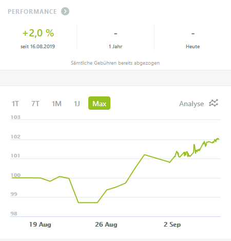 hat Dirks Fond aktuell im Prinzip nichts hinzugewonnen. Seit Auflage vibriert der Fonds um seinen Einstandspreis (ca. 100 €). Da spar ich mir die Fondskosten, und bilde das Ganze selbst ab.