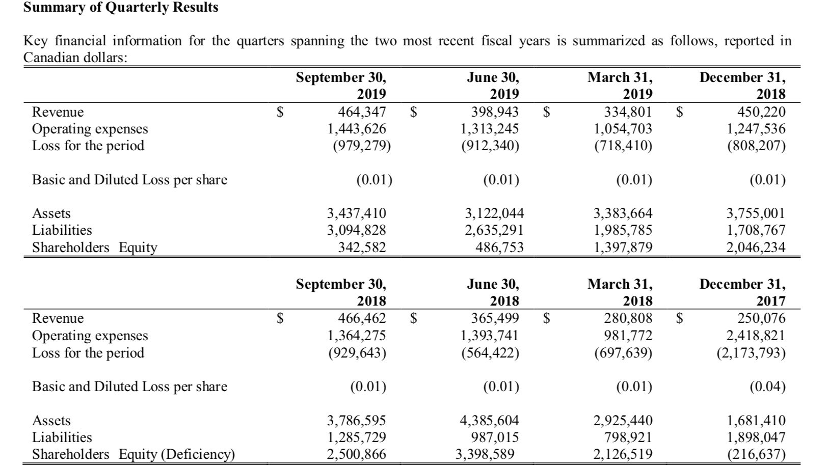 Revenue 464.000 CAD, Expenses 1,4 Mio CAD, loss period 982.000 CAD.