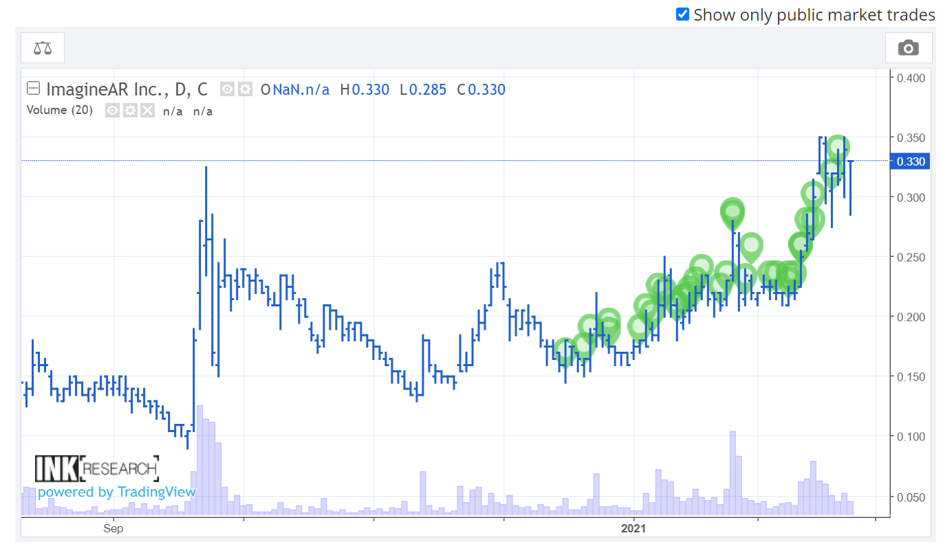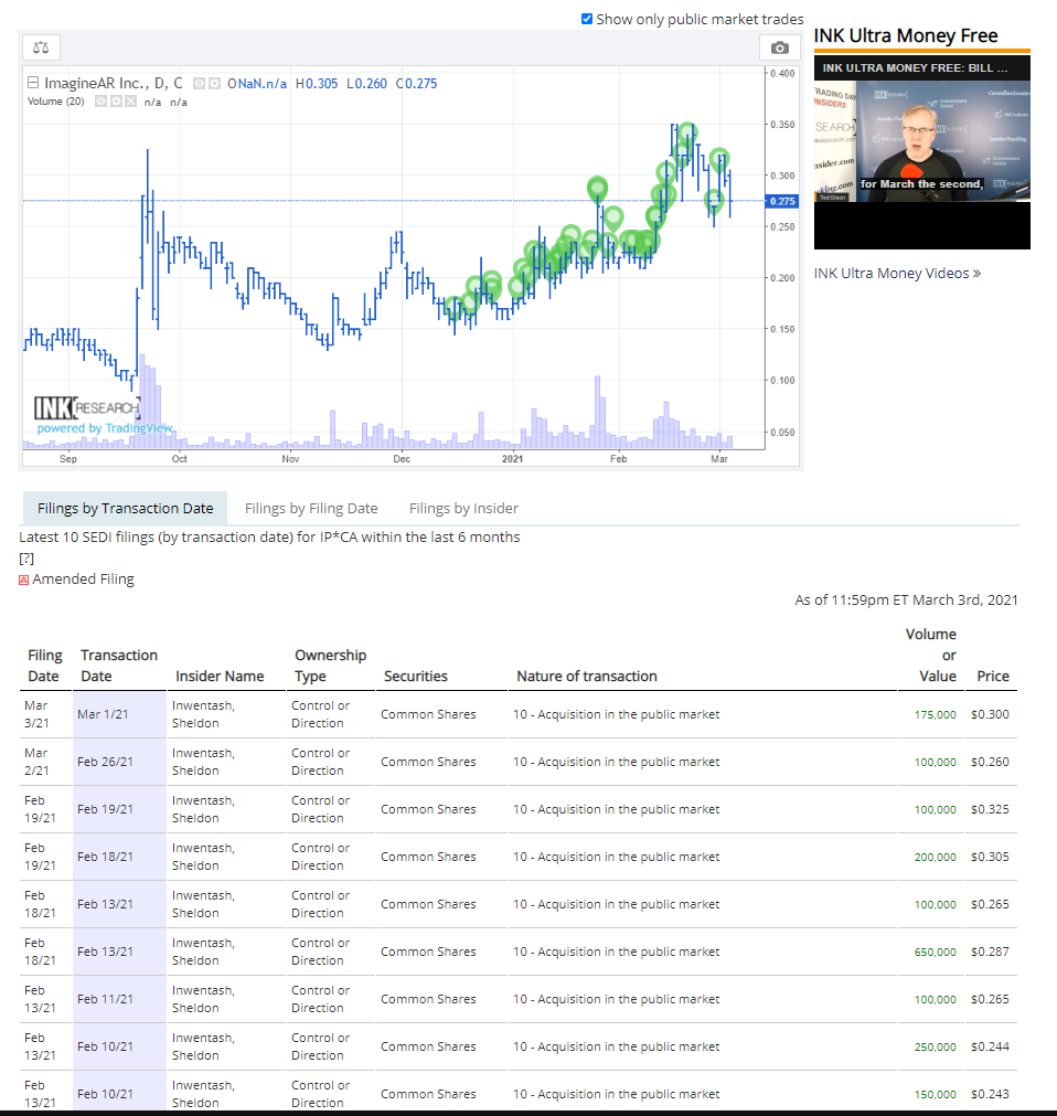 SEDI-Report Insiderkauf Der Chairman von ImagineAR hat sich gestern im regulären Handel nochmals eine ordentlich­e Portion Aktienpake­te (Preise ca. zwischen 20$ und 21$ CAD) gegönnt und hält jetzt eine stattliche­ Anzahl von mehr als 800.000 Aktien. Ich deute das als weiteres gutes Vorzeichen­ und glaube an eine restliche grüne Woche.