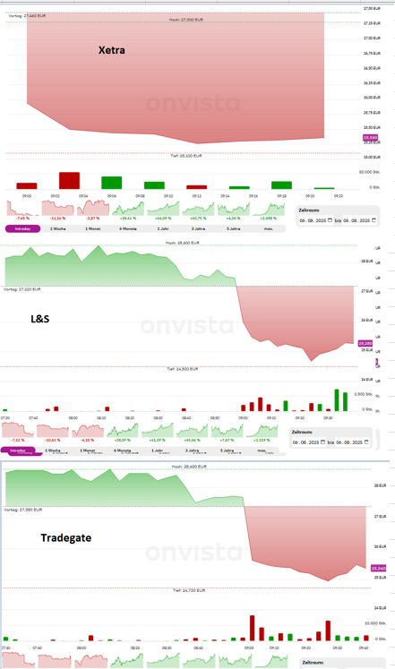 Die Profis mögen sie anscheinend dennoch nicht. Hohe Volumen auf Xetra, während Kleinanlegen vorbörslich noch bereit waren bis zu 28,60 zu zahlen