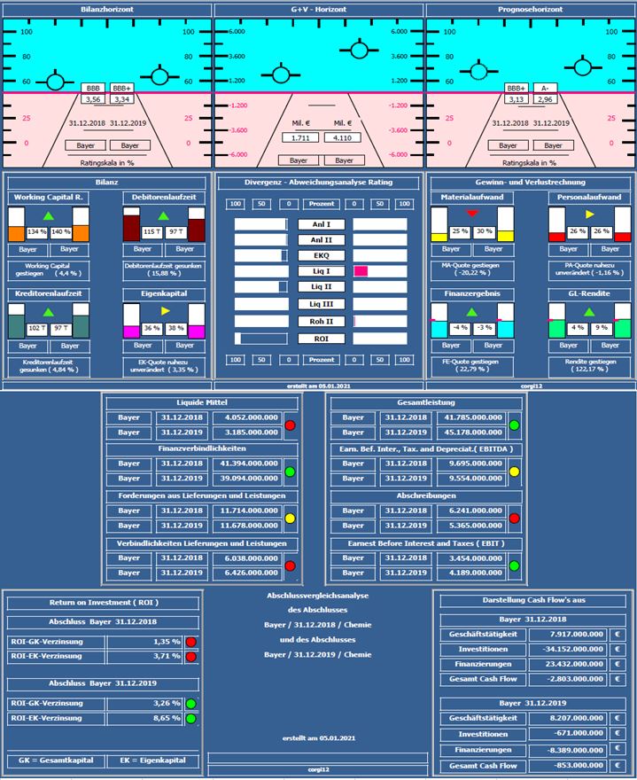 Positiv: Gesamtleistungswachstum ca. +8%, Eigenkapitalquote und Anlagendeckung leicht verbessert. Nettofinanzverbindlichkeiten von -37 MRD. € um ca 1,4 MRD.€ in 2019 reduziert. Der erheblich gestiegene Jahresüberschuß um 2,4 MRD. € relativiert sich, da er 1,6 MRD.€ Veräußerungsgewinne für Currenta enthält.