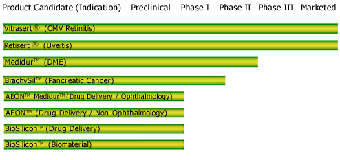 pSivida besitzt die Rechte für die Entwicklung und kommerzielle Verwertung einer modifizierten Form von Silizium (poröses oder nanostrukturiertes Silizium), bekannt als BioSilicon™, das in den Bereichen Medikamentenapplikationen, Wundheilung, Orthopädie und Tissue Engineering zur Anwendung kommt. Das am weitesten fortgeschrittene BioSilicon™ Produkt, BrachySil™, transportiert den therapeutischen Wirkstoff P32 direkt in festes Tumorgewebe. Das Produkt befindet sich derzeit in klinischen Phase II-Studien zur Behandlung von Leber- und Bauchspeicheldrüsenkrebs.