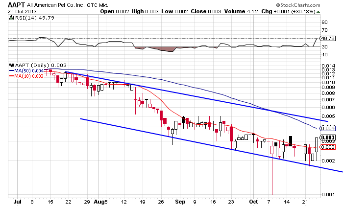 All American Pet Company, Inc. (OTCBB: AAPT) -- AAPT is working diligently with its strong new finance team, including its new VP of finance, to become current and compliant with its SEC and legal filings. Outstanding filings will be completed in the very near future. Our day to day operations people are pressing to catch up on all manufacturing, sales and marketing, fronts to secure a national retail presence.