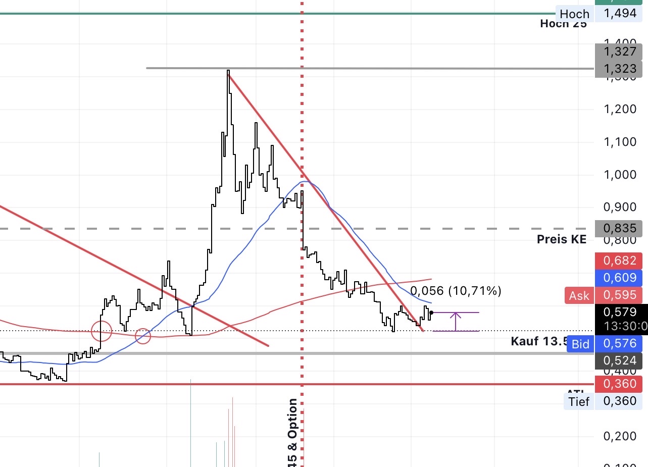 Wir stehen nicht kurz vor, sondern kurz nach dem Tiefpunkt der Aktie. Ich hab super eingekauft, allerdings nicht zu 0,45 Cent (das wäre arg billig), sondern zu 0,524 CAD, das war aber tatsächlich recht günstig. Klar bin ich nur mit kleinen Beträgen im Plus, da wohl niemand bei einem solchen start-up all in geht. Ich habe aber in der Vergangenheit mit Nano One immer gute Erfahrungen gemacht, weil ich entdeckt habe, dass die Aktie sich stets folgsam an die von mir eingezeichneten Chartmuster hält. Im übrigen bin ich bescheiden. Was ich als "gut im Plus" empfinde, mag für andere lächerlich sein.
