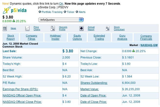 PSDVV 3.80, +0.64, +20.3%) (ASX VA) today announced that it received notification from the NASDAQ Stock Market that it had regained compliance with Marketplace Rule 4450(a)(5) (the Rule) relating to the maintenance of a minimum $1.00 bid price of the company's American Depository Shares (ADSs). The company had been notified in December 2007 that it was in violation of NASDAQ's minimum bid price requirements.. Since then, the company's ADSs maintained a closing bid price at $1.00 or greater for at least 10 consecutive business days. Accordingly, NASDAQ notified the company that it had regained compliance with the Rule and that the matter is now closed. The company is in the process of reincorporating as a US company, and the pSivida securities traded on NASDAQ changed on June 11, 2008 from ADSs to common stock. pSivida Corp.'s common stock will trade under the symbol PSDVV for as long as the common stock is trading on a when-issued basis. After the common stock of pSivida commences regular trading on NASDAQ, it is expected to trade under the symbol PSDV, the same symbol previously used for its ADSs.