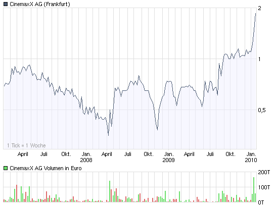 Es wurden extrem viele Kinos abgegeben, dadurch sollte die Kette auch nachhaltig profitabel sein. Und die Aussichten in 2010 stimmen auch. Hinzu kommt, dass Kloiber kauft wie wild. Ich schliesse auch eine Dividende nicht aus, bei Cinemedia gibt es auch schon lange eine. Und das ist auch eine Kloiber-Bude.