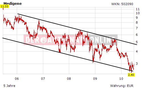 DER AKTIONÄR bleibt auch nach der erfolgreichen Krebsstudie bei seiner negativen Einschätzung für die Medigene-Aktie. Das Papier befindet sich trotz heutiger Zugewinne in einem langfristigen Abwärtstrend und notiert nahe an seinem Fünf-Jahres-Tief. Derweil warten Marktteilnehmer weiter vergebens auf eine so dringend benötigte Kooperation. Schon bald könnte dem Biotechunternehmen das Geld ausgehen. Erst wenn eine Partnerschaft bekannt gegeben wird, wird DER AKTIONÄR die Situation neu beurteilen. Bis dahin heißt es für den Anleger: Finger weg von der Aktie.