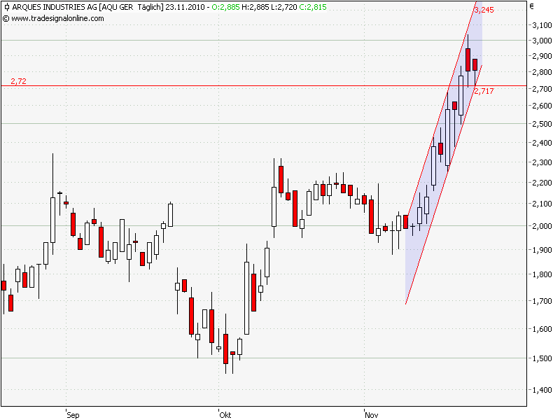 Erstamal ist es so, dass klassische horizontale Widerstandsmarken nicht so sehr in Frage kommen, weil sie auch bei dem Niedergang des Kurses keine große Rolle gespielt haben. Wir hatten sicherlich eine Zone zwischen 2,20 und 2,60, die auch tatsächlich in der zweiten Oktoberhälfte wieder eine gewisse Rolle spielte, dieser Widerstand ist aber offenbar überwunden. Insofern kann man eine Unterstützung bei ca. 2,60 nun erwarten.