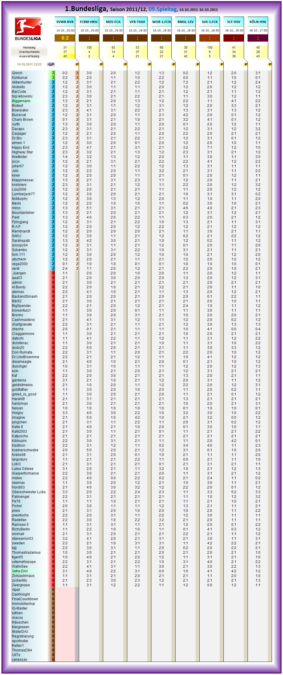 In Sachen Gesamtwertung nun Pjöngjang und R.A.P. zu zweit vorne weg mit je 92 Punkten.. Loki3 geht ja leer aus mit dem Freitagsspiel und bleibt bei 90 Punkten.. Boersiator bei 86 Punkten, dnach Lumberjack77 und Richy Berlin mit je 84 Punkten....
