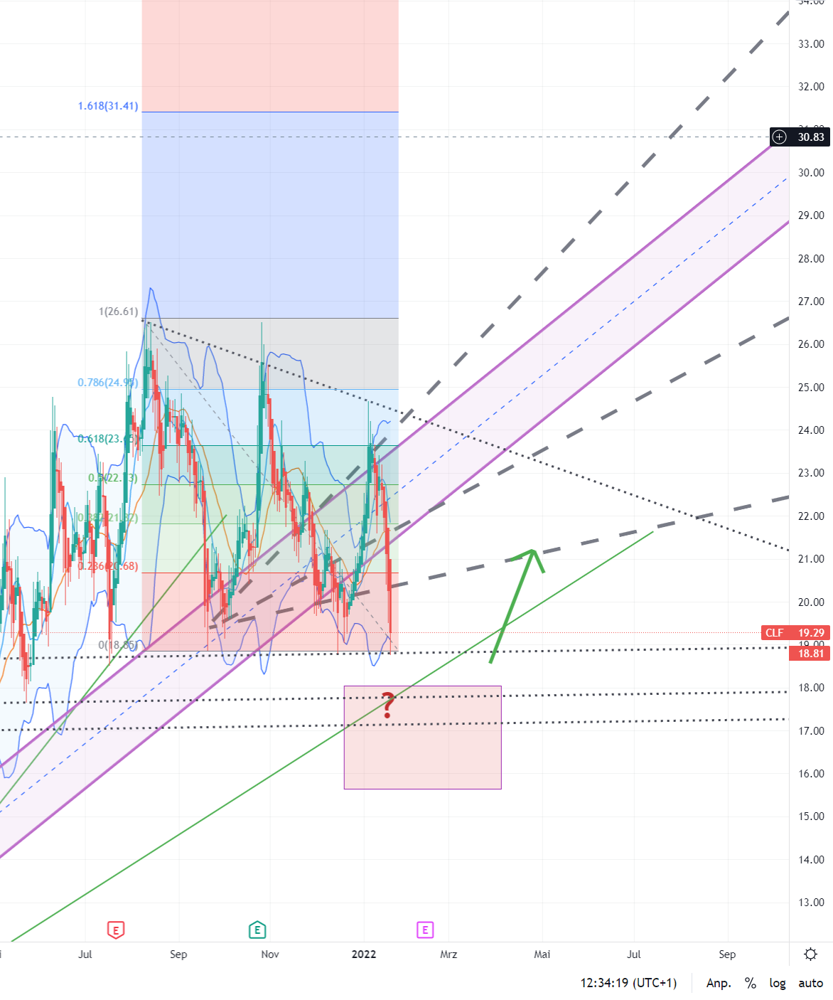 ziemlich genau bis Mitte Februar glaubt, dass die Stahlpreise nachgeben, um dann zu realisieren, dass die Warmgewalzten stabil bleiben. Dann wird man sicher wieder damit beschäftigen und merken, dass es für einen mit eigenem Erz ohnehin komfortabel ist. Vorher spekuliere ich auf den Dipp in das eingezeichnete Rechteck.