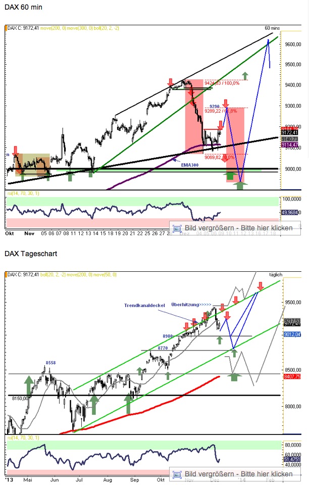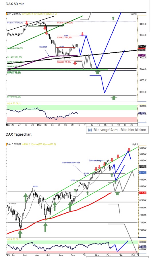 1. Der DAX sollte gestern in der Hauptvariante bis 9290 steigen, ohne zuvor unter 9085 zu fallen. Er pendelte aber 60 Punkte um die 9200