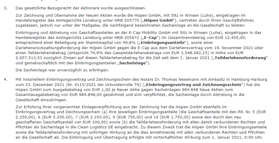 3.§Das gesetzliche Bezugsrecht der Aktionäre wurde ausgeschlossen.Zur Zeichnung und Übernahme der Neuen Aktien wurde die Höpen GmbH, mit Sitz in Winsen (Luhe), eingetragen im Handelsregister des Amtsgerichts Lüneburg unter HRB 205770 („Höpen GmbH“), vertreten durch ihren Geschäftsführer, zugelassen, jedoch nur unter der Maßgabe, die nachfolgend bezeichneten Sacheinlage an die Gesellschaft zu leisten:Einbringung und Abtretung von Geschäftsanteilen an der E-Cap Mobility GmbH mit Sitz in Winsen (Luhe), eingetragen in das Handelsregister des Amtsgerichts Lüneburg unter HRB 205672 („E-Cap“) im Gesamtnennbetrag von EUR 12.450,00, entsprechend einer Beteiligung am Stammkapital von 49,8% („Einbringungsanteile“), sowie einer Darlehensrückzahlungsforderung der Höpen GmbH gegen die E-Cap aus dem Darlehensvertrag vom 19. November 2021 über einen Teildarlehensbetrag (entspricht 74,9% des Gesamtdarlehensbetrags von EUR 3.548.082,15) in Höhe von EUR 2.657.513,53 zuzüglich Zinsen auf diesen Teildarlehensbetrag für die Zeit seit dem 1. Januar 2021 („Teildarlehensforderung“ und gemeinschaftlich mit den Einbringungsanteilen „Sacheinlage“).Die Sacheinlage war unverzüglich zu erbringen.