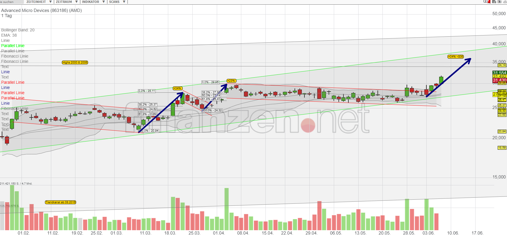 hier mal wieder ein Chart ohne viel Erklärung. Der Erfolg von AMD feuert den Kurs weiter an. Und Zen2 ist noch nicht einmal auf dem Markt.