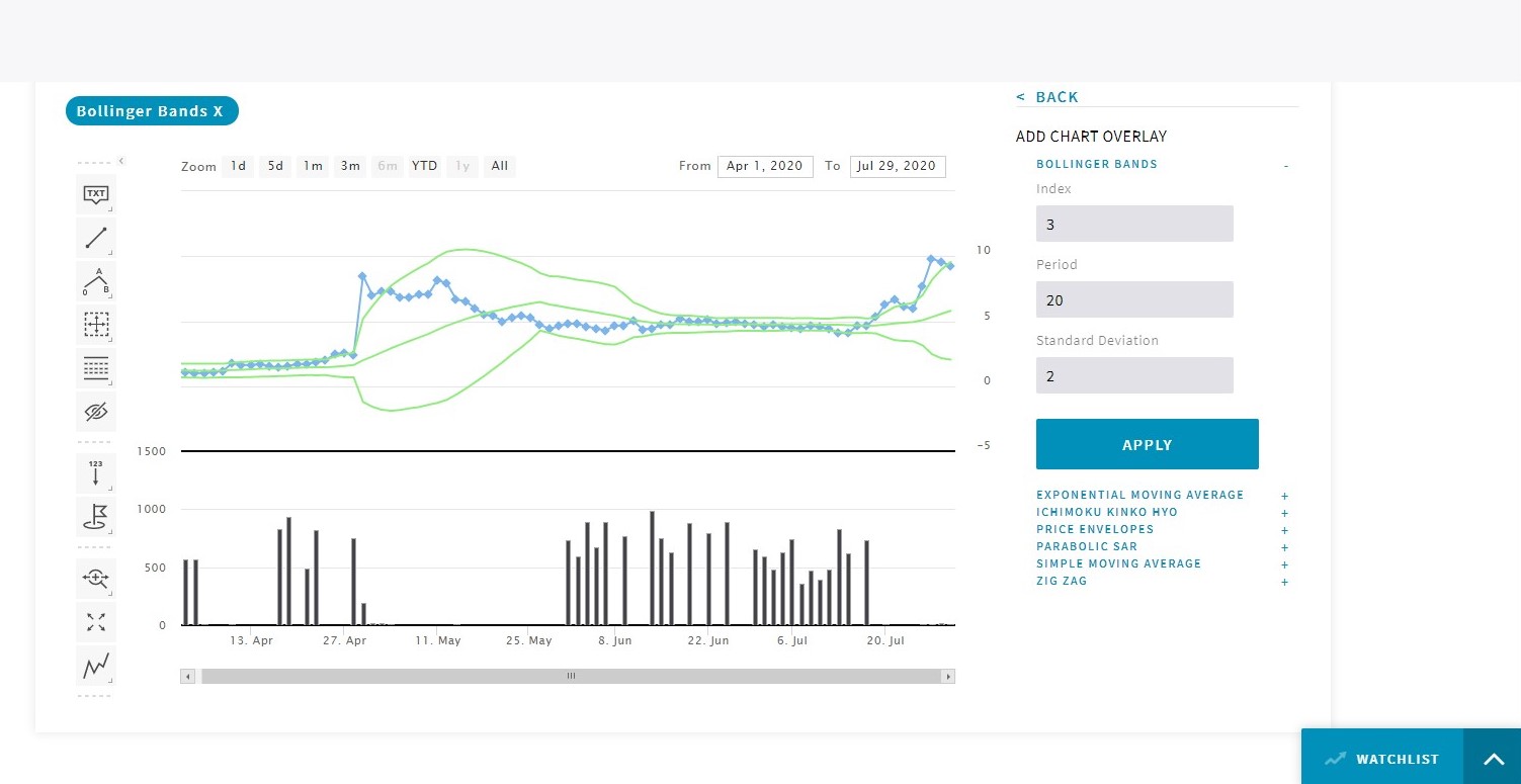 um die 4€? Habe mal über die Nasdaq Seite eine Bollinger Analyse angeklickt. Bin absolut kein Chart Experte, aber per Definition sind bei Unterschreitung des oberen Bandes weiter sinkende Kurse zu erwarten. Ich bin übrigens mit meiner Position bei exakt 10€ komplett ausgestiegen, entgegen meines vorherigen Plans den Gewinn laufen zu lassen. Jetzt überlege ich gerade wann es wieder günstig ist einzusteigen. An der Unternehmenssituation hat sich ja aktuell nichts geändert, so dass ein drastischer Kursverfall eher nicht zu erwarten ist - Wie seht Ihr das?
