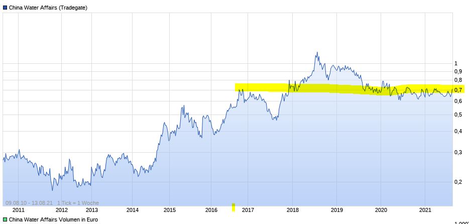 Ich freue mich jetzt erst mal auf die nächste Dividendenausschüttung von China Water Affairs am 18. Oktober 2021 und HALTE weiter. Zwar hält die Seitwärtsbewegung jetzt schon elend lange an, aber offenbar scheint die Aktie bei €0,63 einen Boden gefunden zu haben. Ich hoffe, daß zum Herbst hin noch eine kleine Kursrallye (auf die Dividende) einsetzen wird, warte ab und genehmige mir einen Schluck Wasser dabei.