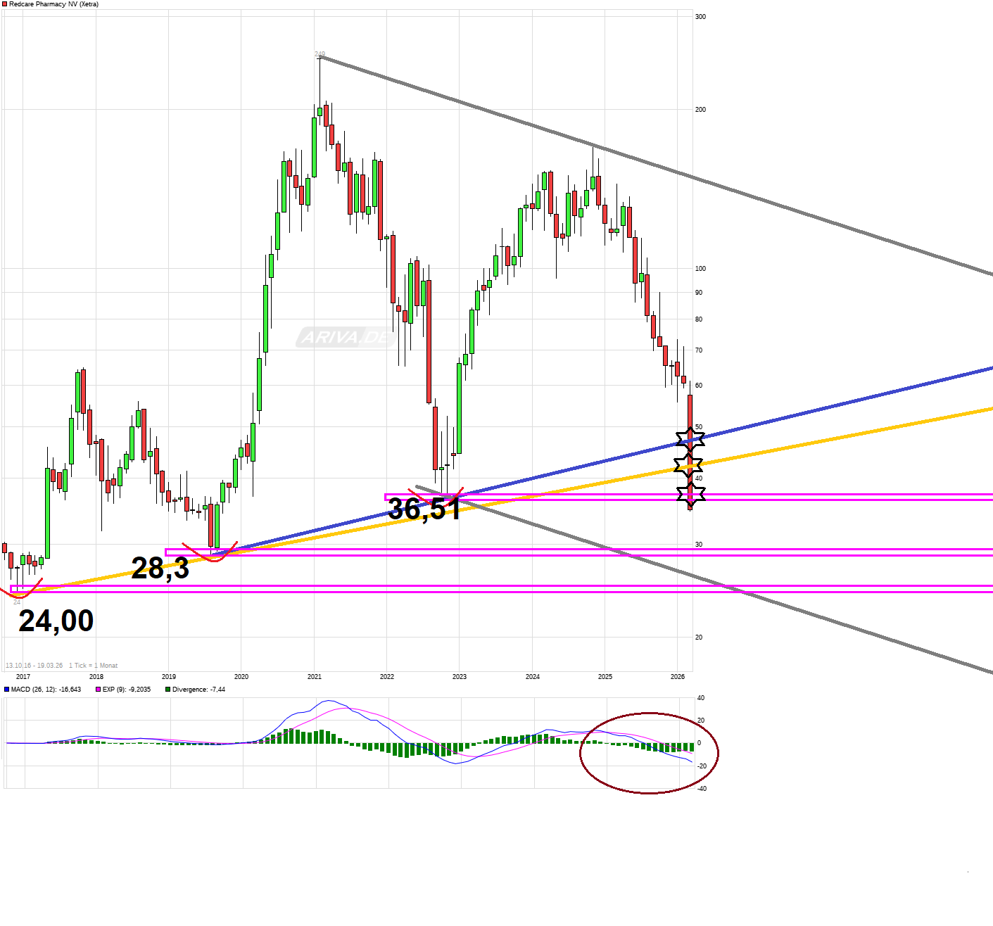 Sehe ich völlig anders. Die Positionen der LV haben ja absolut nichts mit dem Verfalltag am Hut. Da verfällt oder ändert sich genau NULL durch den Verfallstag morgen für die LV. Die LV haben keine Aktienoptionen (die morgen verfallen), sondern sich Aktien selber geliehen mit längerer Leihfrist, die weit über den den morgigen Tag geht. Die haben am Montag weiter die gleiche Größe an Position und warten ab bis mal der Boden erkennbar wird. Heute wurde die horizontale Unterstützung bei 36,51€ gerissen und auch beim DAX weicht wie wichtige horizontale Unterstützung rund um den Bereich 22930 immer weiter auf durch den Ölpreisanstieg und könnte u.U. einen weiteren Rutsch am Gesamtmarkt bringen, der auch auf Einzelaktien dann weiter ausstrahlt. Hier kommt also zu den drückenden schlechten News die Redcare selber zuletzt immer wieder rausbrachte auch das Gesamtmarktrisiko noch hinzu. Nächste horizontale Unterstützung liegt unter der 30€ Marke. Und "großer Verfall" ist mit Blick auf den Kursverlauf der Aktie schon seit einem Jahr. Man sollte an dieser Stelle vielleicht auch mal ein Lob an die Weitsicht der LV aussprechen, die anders als die Dauerbeschöniger, hier schon früh die totale Überbewertung und die zunehmende umsatz- und margendämpfenden Wettbewerbsverschärfung erkannt haben und sich entsprechend richtig positionierten. Ich hatte darauf oft auch schon hingewiesen als die Aktie noch doppelt und dreifach so hoch stand. Wurde dafür von bestimmten Leuten immer niedergemacht. Bislang keiner von denen zu sehen die nun sagen würden: "Sorry, da habe ich dir Unrecht getan". Na ja, so ist das eben, wenn man in einem Forum auch die kritischen Dinge anspricht. Kann ich mit leben ;) Ebenso habe ich oft genug gepostet und mit Fakten belegt wie sinnlos und gefährlich es ist auf Analysten zu hören. Genaus hatte ich oft genug auf die noch immer dominierenden Verkaufssignale der CT hingewiesen und von Käufen abgeraten solange diese Signale keine starke Umkehr aufzeigen. Wer sich also mit der Aktie schon vor Monaten beschäftigt hat anstatt mantraartig nur täglich die LV zu beschimpfen als "Drückerbande", der dürfte hier schon lange nicht mehr von den weiter zunehmenden Verlusten betroffen sein, da man verkauft hat oder ebenfalls hier auf der kurzen Seite mitgelaufen ist.