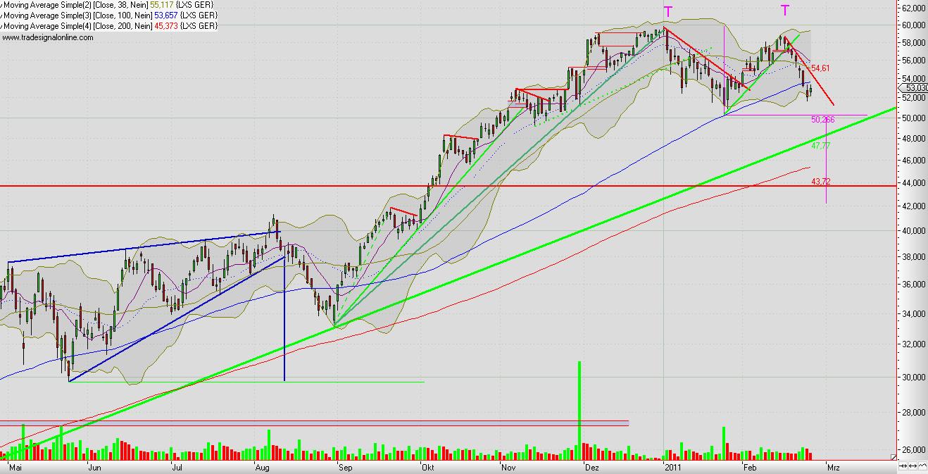 Solange der derzeitige Konjunkturaufschwung Bestand habe, erwarten auch die Experten von EURO am SONNTAG eine auf hohem Niveau anhaltende Nachfrage nach den Produkten der Lanxess AG. Als Marktführer in wichtigen Produktsegmenten könne das Unternehmen Preiserhöhungen aufgrund von steigenden Rohstoffkosten in einem positiven Konjunkturumfeld "relativ leicht" durchsetzen. Die Wachstumsstrategie des Spezialchemieproduzenten basiere auf zwei Schwerpunkten. Erstens konzentriere sich das Unternehmen auf die Expansion in die Wachstumsmärkte der Schwellenländer und zweitens sei der Fokus gerichtet auf globale Trends, wie Mobilität, Landwirtschaft, Urbanisierung und Wasser. EURO am SONNTAG erwartet, dass die Gewinnschätzungen der Analysten in Folge der guten Quartalszahlen angehoben werden und aktuelle Bewertungskennziffern (z.B. 2012-KGV von 9,8) sinken dürften. In einem sowieso intakten Aufwärtstrend sollte die Aktie weiteren Spielraum für Kursgewinne in Richtung von 75,00 Euro haben, mithin ein Aufwärtspotential von mehr als 23%.