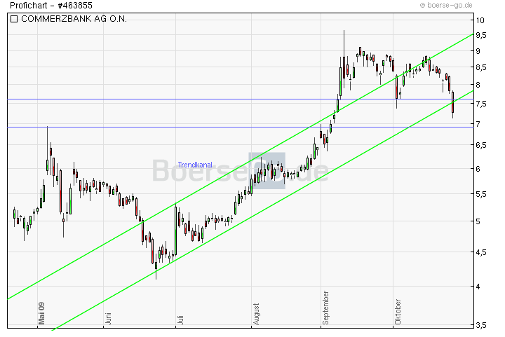 Mit dem Fall auf 6,50 Euro hat die Commerzbank nicht nur das Zwischentief vom 28. Oktober bei 6,66 Euro unterschritten, sondern auch das Tief vom letzten Freitag. Zumindest hält bislang die horizontale Unterstützung bei 6,50 Euro, nachdem diese heute Morgen auch schon zeitweise gebrochen wurde.