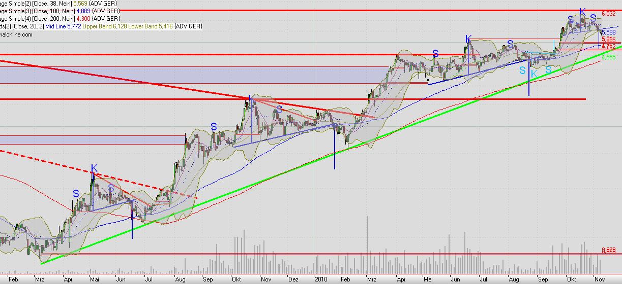 adva ist ein gapclose papier. bis auf das breakawaygap vom low wurden immer alle lücken geschlossen. dazu kommt noch die sks. die 200 tage line wurde bisher auch in regelmäßigen abständen berührt. der aufwärtrstrend wäre aber durch den kursrückgang noch nicht in gefahr