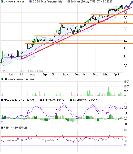 Viele leute denken bei Trends ja immer nur an die Linie, die jeder idot da runten ranmalen kann. Im Grunde besteht ein Trend aber vor allem aus dem Überwinden von Verlaufshochs und das möglichst mehrere Male. Umso öfter umso stärker ist der Aufwärtstrend. Und das ist bei ls telcom perfekt zu sehen. Da spielt die eigentliche Linie eine untergeeordnete Rolle.