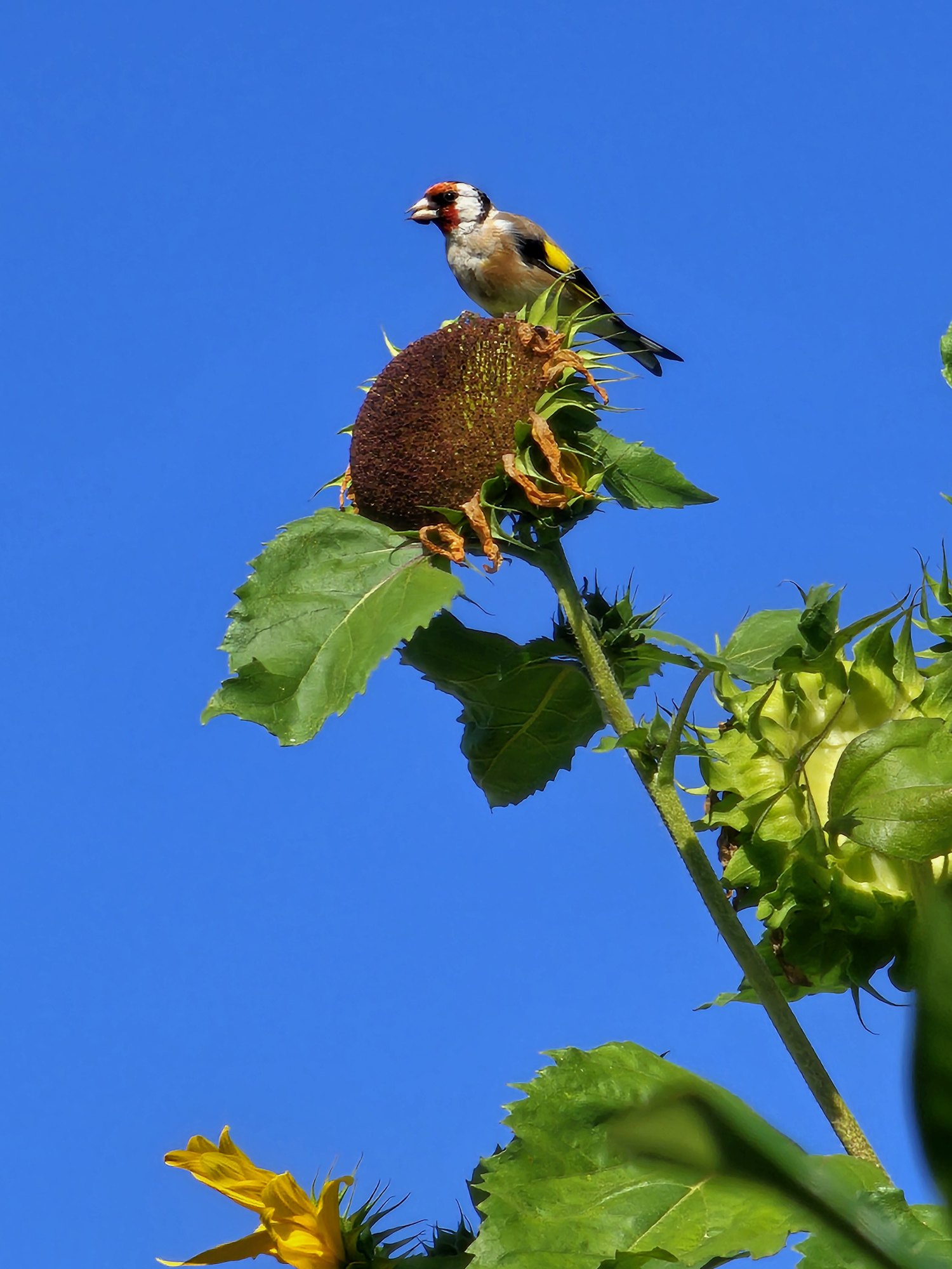 Der erste Zugvogel sondiert schon mal das Nahrungsangebot Richtung Süden. Der Stieglitz taucht bei uns immer nur im Frühjahr und Herbst auf.