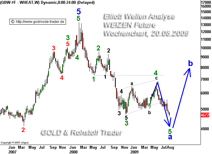 Weizen befindet sich in einer übergeordneten impulsiven Abwärtsbewegung (1-2-3-4-5). Aktuell in der dazugehörigen Welle 5. Diese Welle 5 düfte noch einige Handelswochen laufen.