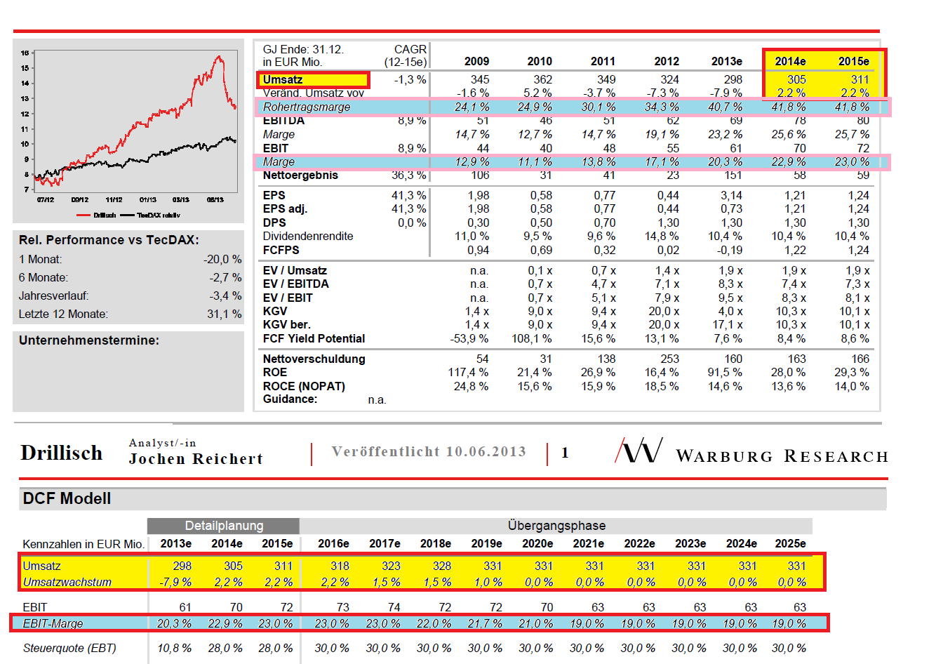Sehe ich ähnlich. Es geht ja um Einmalerträge, aufgedeckte stille Reserven, deren Verwendung und wie sich das eigentliche Geschäft entwickelt ex one-time items. Also die freie Kohle alleine für ARP und aufgeblasene Divis zu "verjuxen" ;) hätte wohl nur temporären Nutzen und wäre für mich ein Zeichen fehlender unternehmerischer Fantasie seitens des Managements. Wichtig ist für mich perspektivsch ein langfristiges solides Wachstum zu sehen. Daher würde ich gerne sehen wie man einen "Plan B" jetzt auf den Weg bringt nachdem "Plan A" (Zusammengehen mit FNT ) gescheitet ist. "Plan A" hätte ja in erster Linie auf der Kostenseite Vorteile gehabt. Da dies nun nicht stattfindet, müßte man nun wohl den Weg gehen den Umsatz deutlicher wieder zu steigern. Man profitierte zuletzt in erster Linie vom Margenwachstum durch den Wandel zum MVNO . Aber die Marge wird die kommenden Jahre auch nicht endlos weiter zu steigern sein und das Vertragskundenwachstum war zuletzt auch eher überschaubar . Daher sollte DRI frühzeitig überlegen, ob man nicht zusätzlich mehr in neue Nischen mit mehr Wachstumspotenzial investiert, um so die Sättigung im "alten" Geschäft in 2 bis 3 Jahren dann zu kompensieren. Wenn man sich z.B. die Warburg Analyse anschaut (andere Studien zeigen ähnliches) , dann sieht man wie die Rohertrags- und EBIT Margen langsam ab 2014/15 wohl austoppen und das Umsatzwachstum eigentlich nicht weit über der Infaltionsrate liegt. Also wenn Drillisch nochmal beim Umsatz einen Zacken zulegen will in den kommenden Jahren, dann sollte man mit der freigewordenen FNT-Kohle nenneswert in neue operative Einheiten investieren und nicht alleine nur kurzfristige Aktionärsgelüste bedienen. Naja, mal abwarten was diese Woche dazu vielleicht noch gesagt wird.