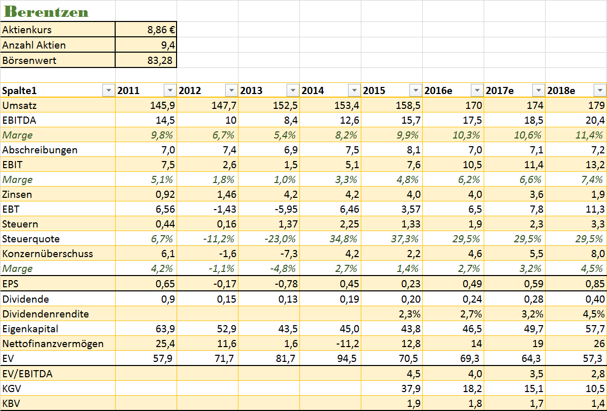 Habe meine 2016er Zahlen leicht nach oben angepasst. Schätzungen für 2017 und 2018 habe ich erst mal gleich gelassen. Habe nur das Finanzergebnis für 2017 von -4 Mio. auf -3,6 Mio noch angepasst, da ja bereits ab dem 18.10.2017 die günstigere Refinanzierung ergebniswirksam wird und bereits in diesem Jahr 0,4 Mio eingespart werden. Für 2018 rechne ich dann mit 2,1 Mio Zinsersparnis. Der CFO hat ja von über 2 Mio gesprochen.