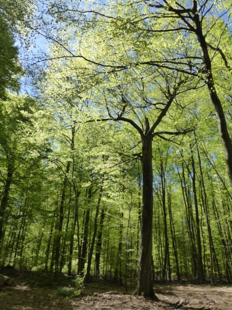 mit ihrem zarten Grün gefallen mir im Frühjahr besonders. Das helle Grün der Buchen, noch total lichtdurchlässig gibt auch einen Blick auf Verwachsungen nach einem Sturmschaden. Die Buche hat einen großen Baldachin ausgebildet.