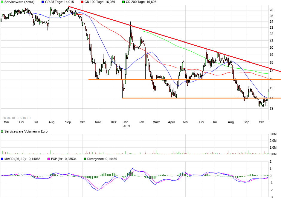 schneller Anstieg bis 16,6-17,0 €, dann ein paar Wochen Konsolidierung, um dann nach den Q3-Zahlen mit Schmackes den Abwärtstrend zu brechen. Hängt dann davon ab, welch organisches Wachstum man in Q3 und in Q4 hinlegt.