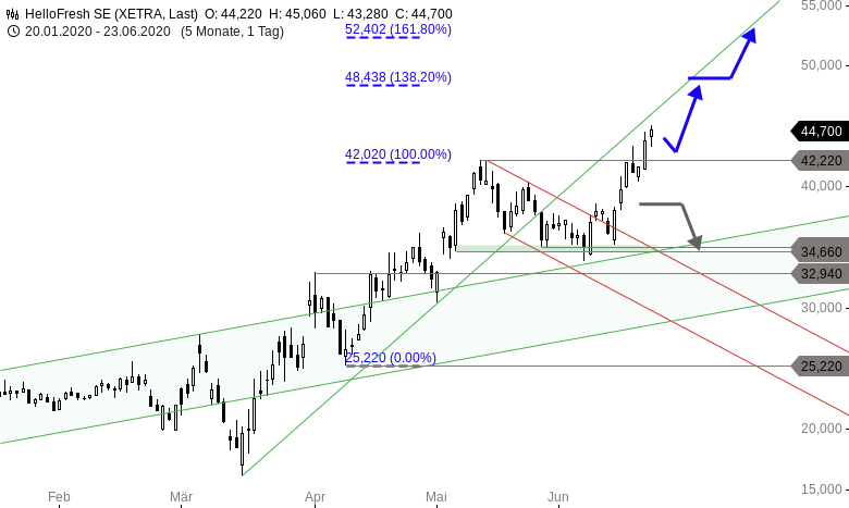HF - Charttechnisch "Bei der Aktie von Hellofresh­ wurde eine bullische Konsolidie­rung zuletzt nach oben hin aufgelöst und eine Kaufwelle gestartet,­ die Ende der Vorwoche bereits auf ein neues Allzeithoc­h führte. Und die Rekordjagd­ geht weiter. "