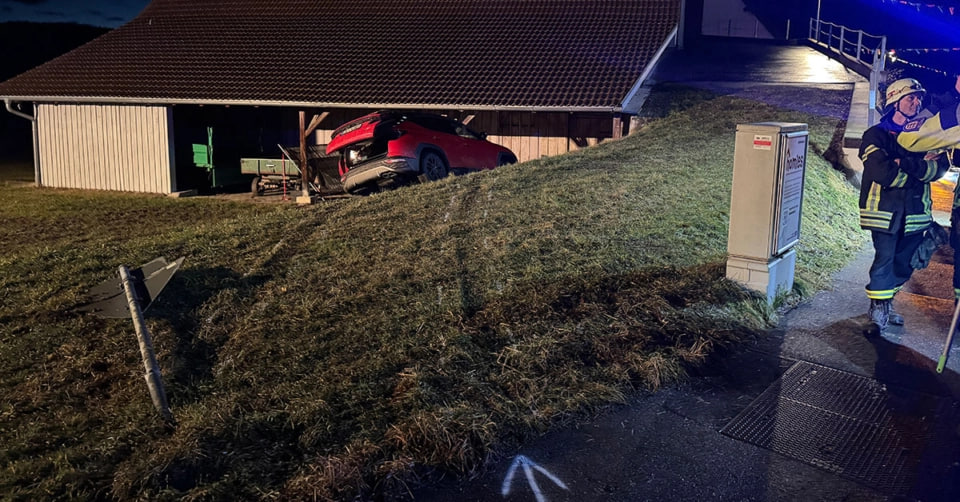 "Der Fahrer kam laut ersten polizeilichen Ermittlungen wegen eines medizinischen Grunds von der Fahrbahn ab und prallte in eine Scheune. Die eingetroffenen Rettungskräfte (...) reanimierten den bewusstlosen Fahrer, der im Anschluss in ein Krankenhaus gebracht wurde."