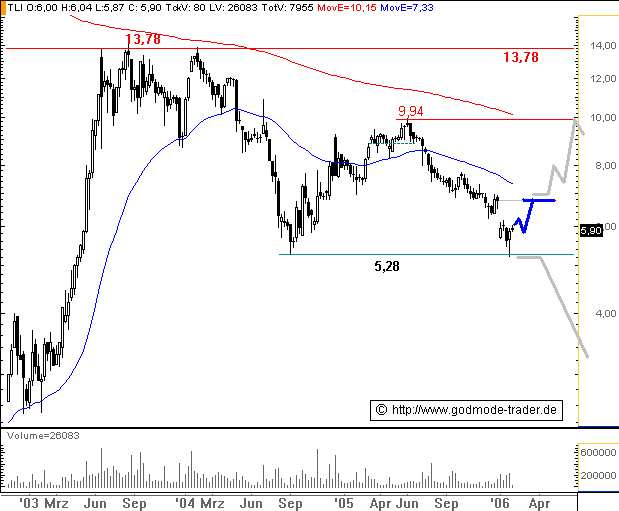 Ein Wochenschlußkurs von 5,60 € könnte bei wohlwollendem Börsenumfeld einen weiteren Anstieg bis 6,00 € im weiteren Verlauf bis 6,87 € zur Folge haben.