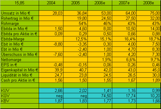 Da die Abschreibungen ab jetzt sich bei 6,0 Mio einpendeln sollen (laut IR) würde sich selbst bei einer um 3-5% fallenden Bruttomarge das Ebit in 2007 auf um die 4,0 Mio € erhöhen, wenn man den Umsatz nochmal um 17% steigern würde.