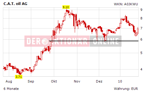 Die spekulative C.A.T. oil-Aktie ist für die Experten von "FOCUS-MONEY" daher interessant. Ein Stoppkurs sollte bei 6,20 EUR platziert werden.