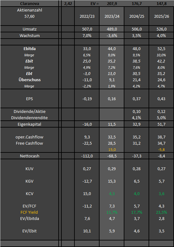 Voraussetzung dafür wäre, dass meine Erwartung von 8,0-8,2% Ebitda-Marge in diesem und 8,8-9,2% im nächsten Geschäftsjahr erreicht wird. Dann hätte man fürs Geschäftsjahr 2024/25 einen FCF Yield von 10,0% bei Aktienkurs von 4,5 €.