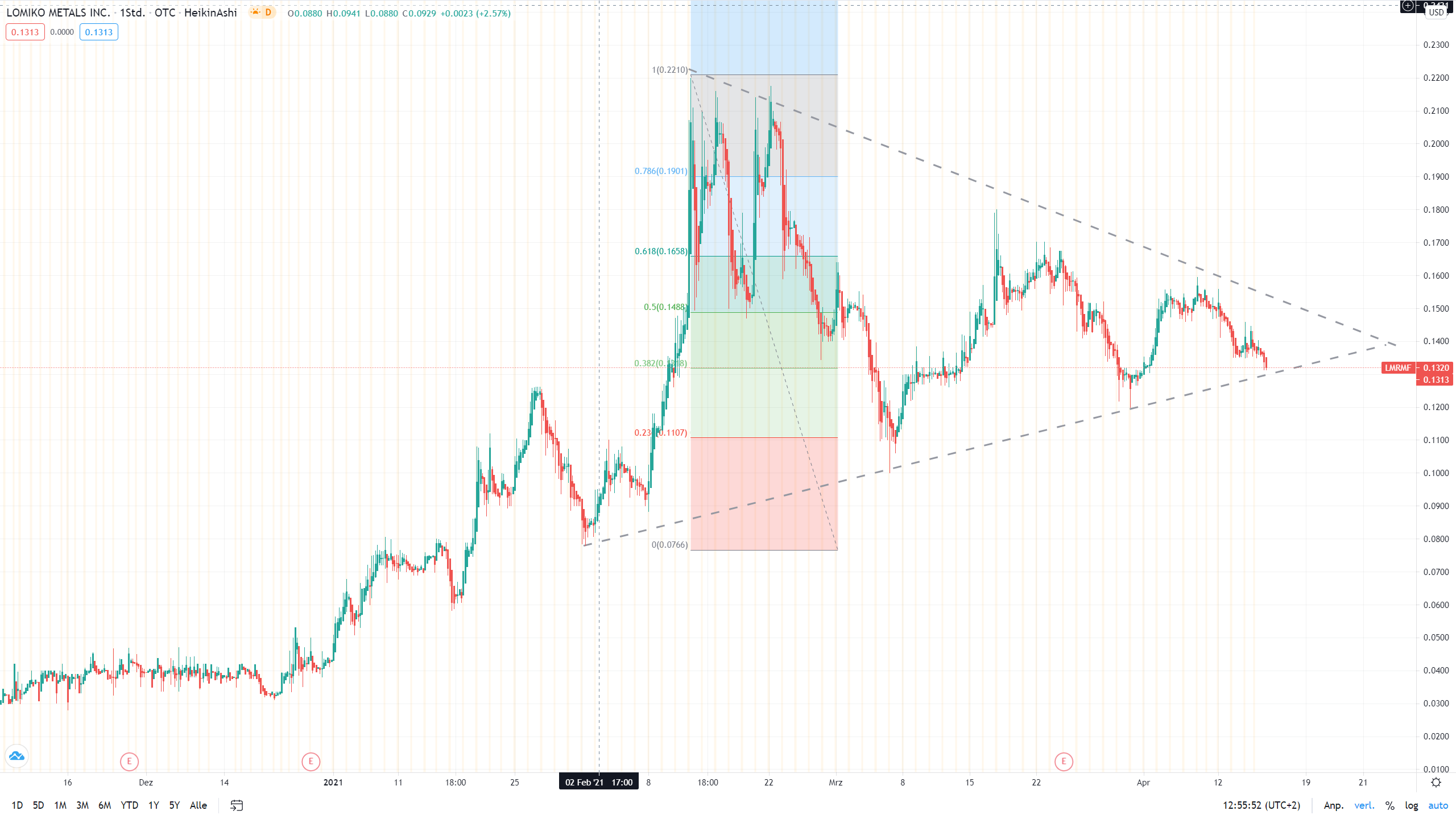 Auf dem Weg nach unten liegt eine gut EK-Zonen im Niveau um 0,1107 USD und 0,1316 USD. Auf 0,1267 USD gibt es eine leichte Unterstützung.