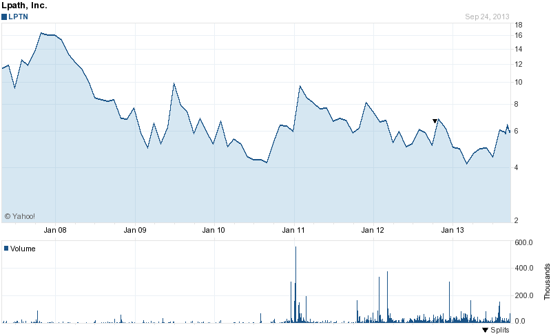 Choppy, low-volume, and outright bizarre trading is not unknown to shares of Lpath (LPTN.OB) but things are starting to look brighter. Last week, the company - who many see as the industry leader in bioactive lipid-targeted therapeutics since only they have demonstrated the ability to generate therapeutic antibodies against bioactive lipids that cause diseases like wet AMD, pain, and cancer - announced a 1-for-7 reverse split of the company's issued and outstanding Class A common stock. There was initially a sell-off as we see during these reverse-split situations. It's likely that a number of investors who had been holding the stock woke up and saw that the stock had shot up in price, only to discover that the seven-fold price increase was a mirage. The last two sessions have seen a nice move to the upside, despite messy overall market conditions.