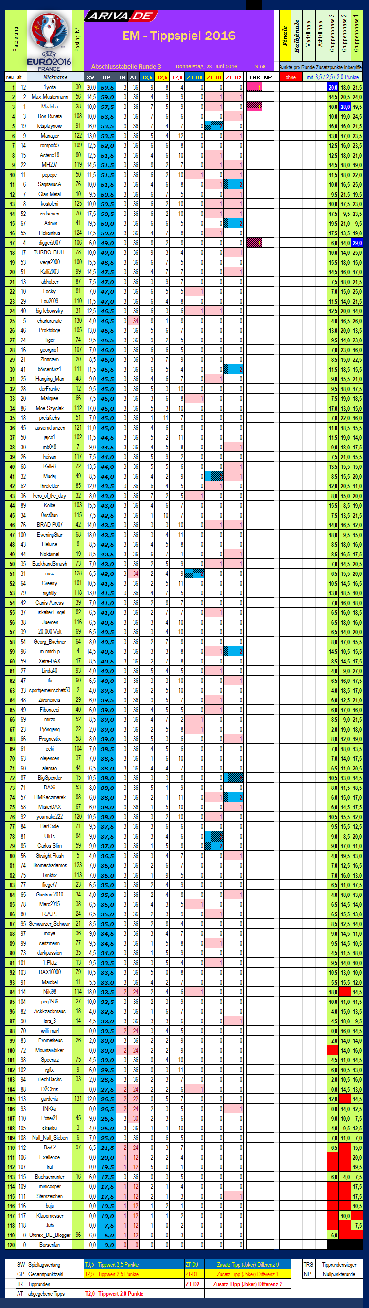 In deinem Fall, darf man deine Tippänderungen (hellblaue Markierungen) als nicht besonders vorteilhaft bezeichnen. Insgesamt war deine hohe Anzahl an Toren in den 12 Begegnungen (bei dieser EM- jedenfalls) wohl auch zu hoch geschätzt, sodass du wahrscheinlich nicht in den Genuss der Zusatzpunkte hättest kommen können, denn auch egal.
