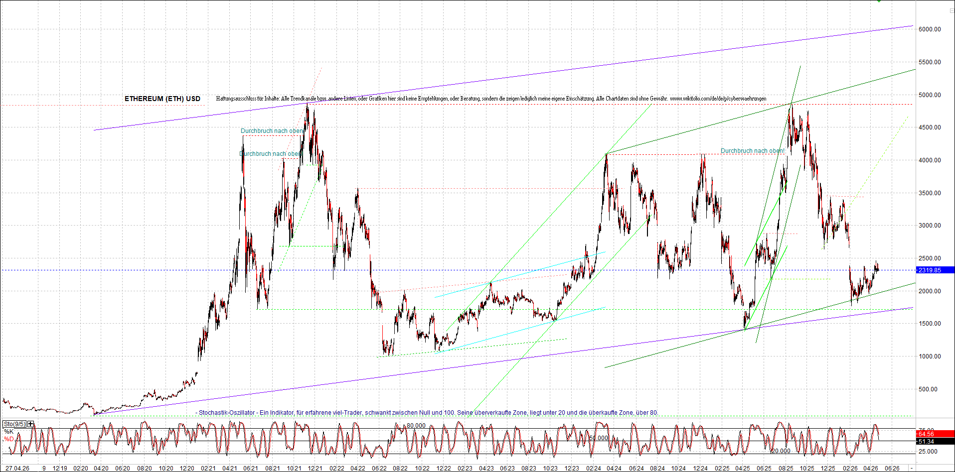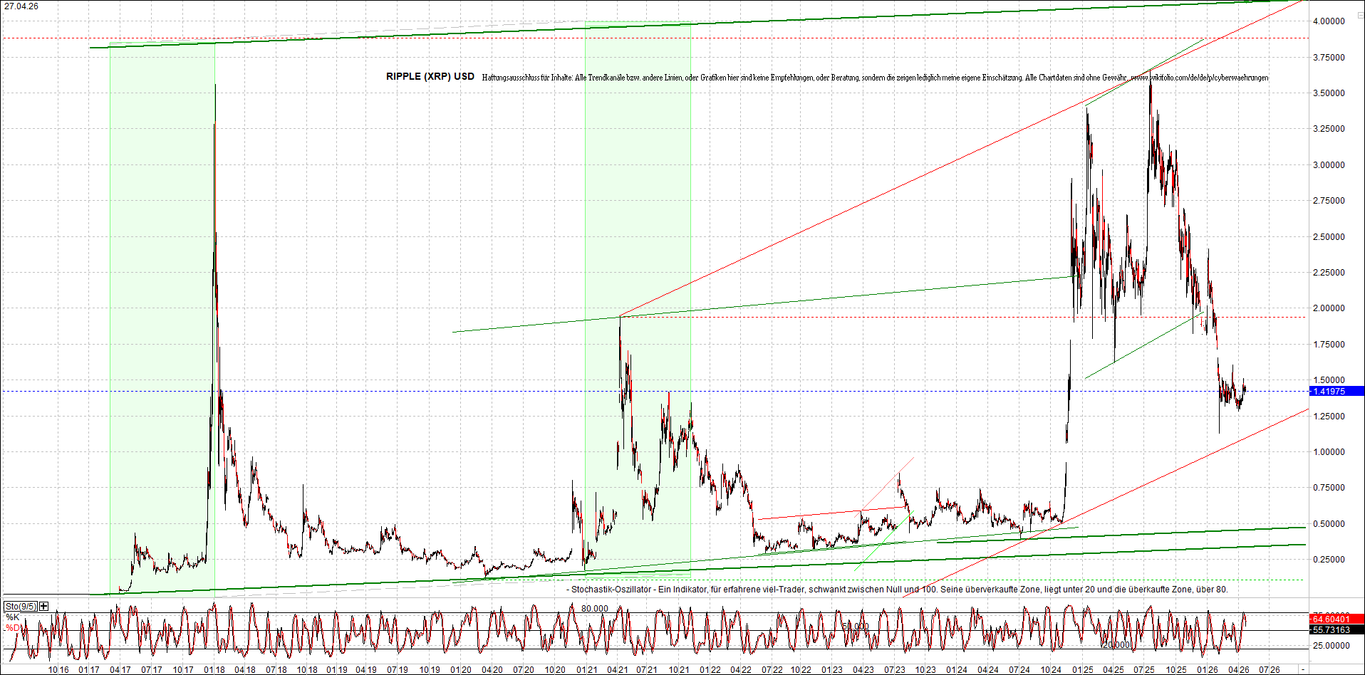 Mehr über die 7 wikifolio-Endlos-Zertifikate gibt es hier. Aber bitte da nicht erschrecken wegen den charts, weil die wikifolios sollten die original-performance so getreu nachbilden wie möglich, aber die charts bei wikifolio zeigen leider nur ein kleines Zeitfenster. Deswegen habe ich hier die entsprechenden langfristigen original-performance-charts reingestellt. Die kann ich auch gerne ab und zu aktualisieren. Die Trendkanäle bzw. andere Linien, oder Grafiken in diesem thread zeigen aber ausschließlich meine eigene Meinung und sind keine Empfehlungen, oder Beratung.