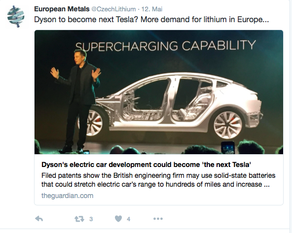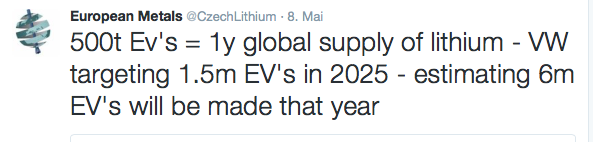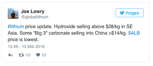 Der Lithium-Preis, der nach China importiert wird ist in den letzten 6 Monaten um 42% Die Nachfrage der Elektro-Autobauer und Tesla werden ihr Übriges dazu beitragen...der Elektroauto-Markt wird bis 2020 (und das ist in vier Jahren schon) auf 100 Milliarden $ geschätzt!